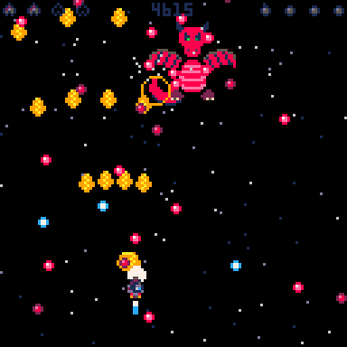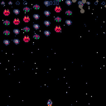 Fantastic Job! Love the pixel art. The explosions are superb. The combination of sprites and particles really pays off. Made me wish I did it myself. Took me a while to identify the bomb as a pickup. Looked too much like a bullet. Otherwise, it's SO goood. My high score is 6555!